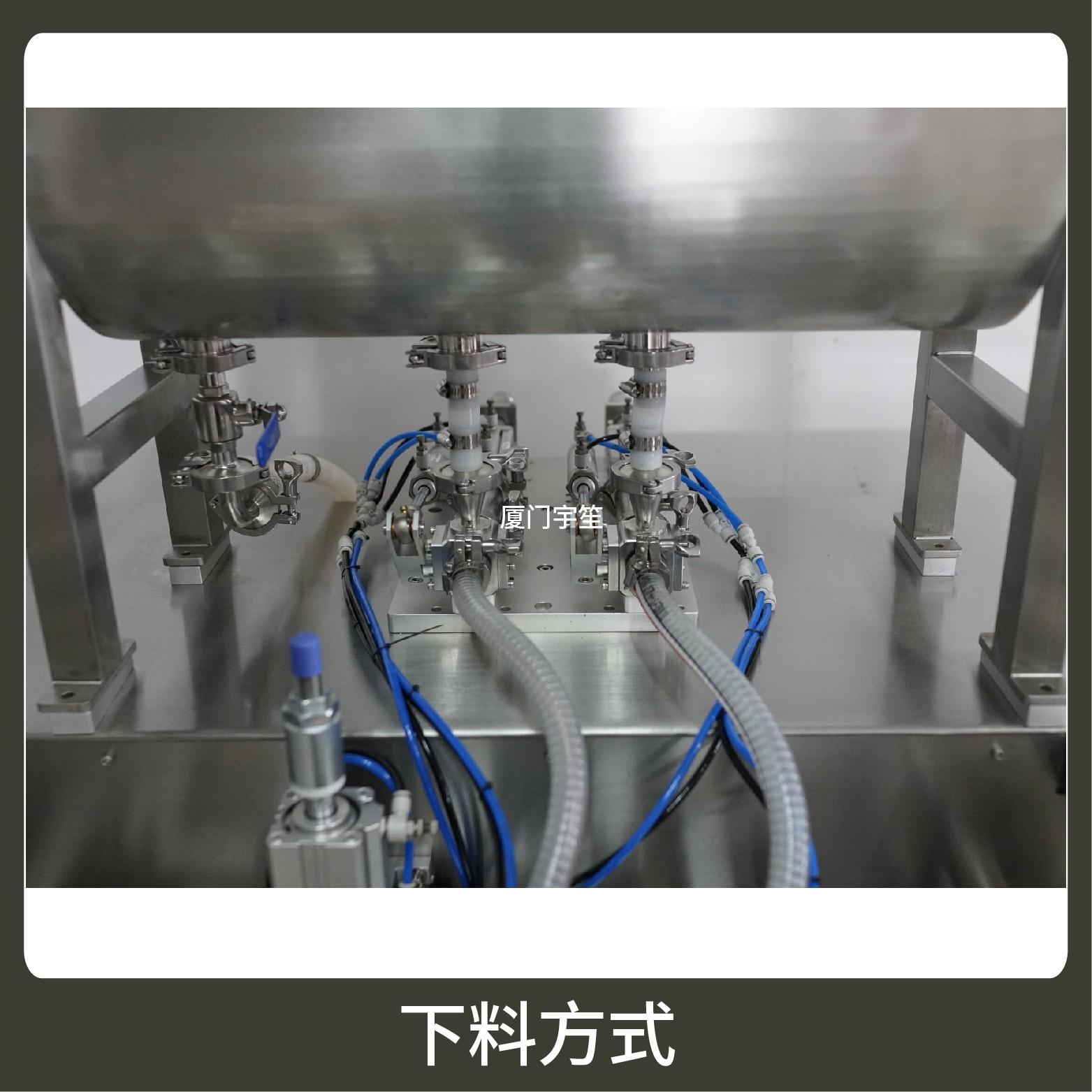 2、成品雙出,包裝流程全自動,無需人工操作??筛鶕?jù)充填物料的性質(zhì)選配不同的下料結(jié)構(gòu)。